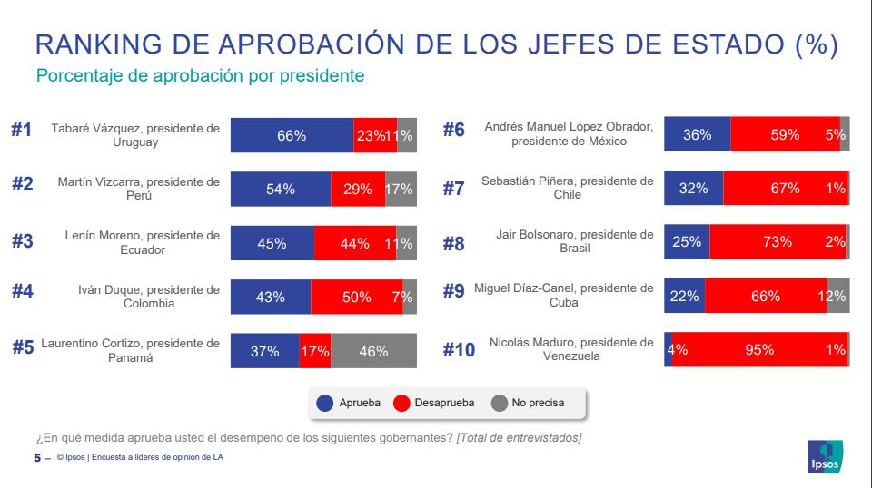En tanto, el presidente de Venezuela, Nicolás Maduro, se encuentra al final del ránking al obtener sólo un 4% de aprobación. Muy de lejos lo sigue el mandatario cubano Miguel Díaz-Canel (22%). En el tercer lugar de las evaluaciones negativas se encuentra Jair Bolsonaro, de Brasil, con un 25% de apoyo.