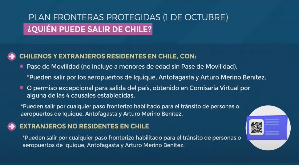 Chilenos y extranjeros residentes en Chile con permiso excepcional para salir del país, el cual se obtiene en Comisaría Virtual por alguna de las cuatro causas establecidas. Pueden salir por cualquier paso fronterizo habilitado para el tránsito o por los tres aeropuertos ya mencionados.