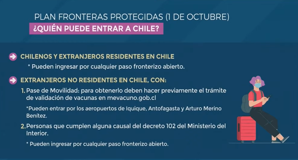 Extranjeros no residentes en Chile que cumplan alguna causal del decreto 102 del Ministerio del Interior por cualquier paso fronterizo abierto, siempre y cuando cuenten con el C19, un test PCR negativo de hasta 72 horas antes de embarcar, un seguro médico de viaje y el Pase de Movilidad.