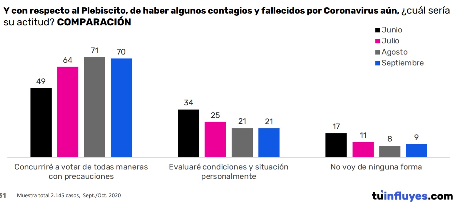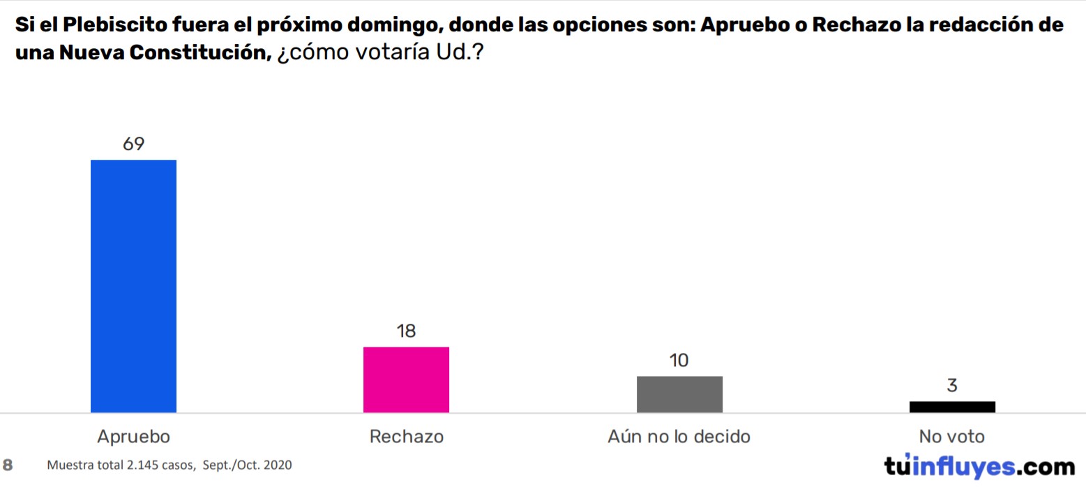 Este jueves la consultora de opinión pública TuInfluyes.com dio a conocer los resultados de su sondeo mensual, el que anticipa un 69% de adhesión a la opción Apruebo en el plebiscito del 25 de octubre y 18% al Rechazo.