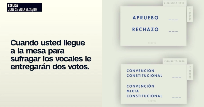 El domingo 25 de octubre se realizará una consulta a la ciudadanía a través de un plebiscito. Cuando el o la votante llegue a la mesa para sufragar, los vocales le entregarán dos votos.