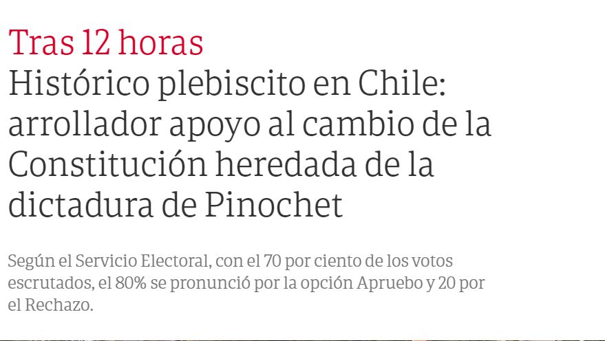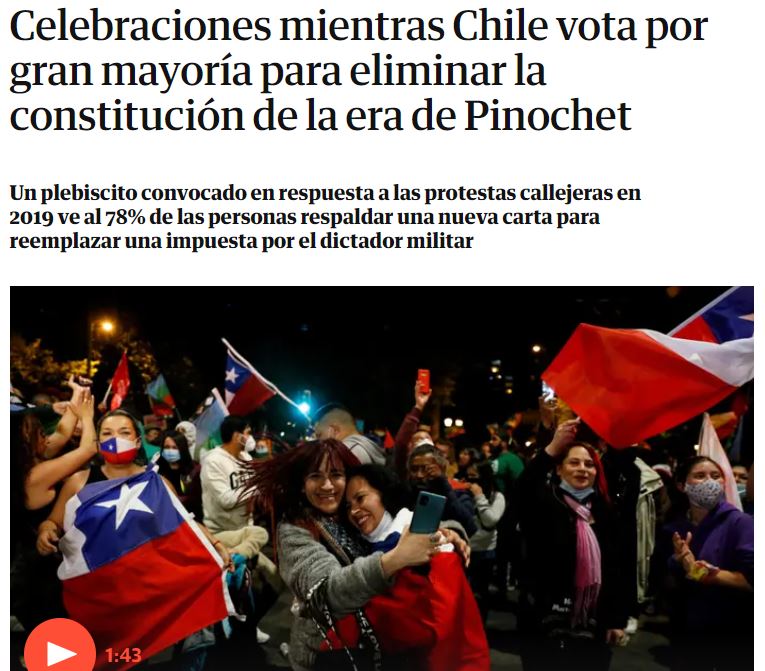 The Guardian tituló: “Chile vota por gran mayoría para eliminar la constitución de la era de Pinochet”.