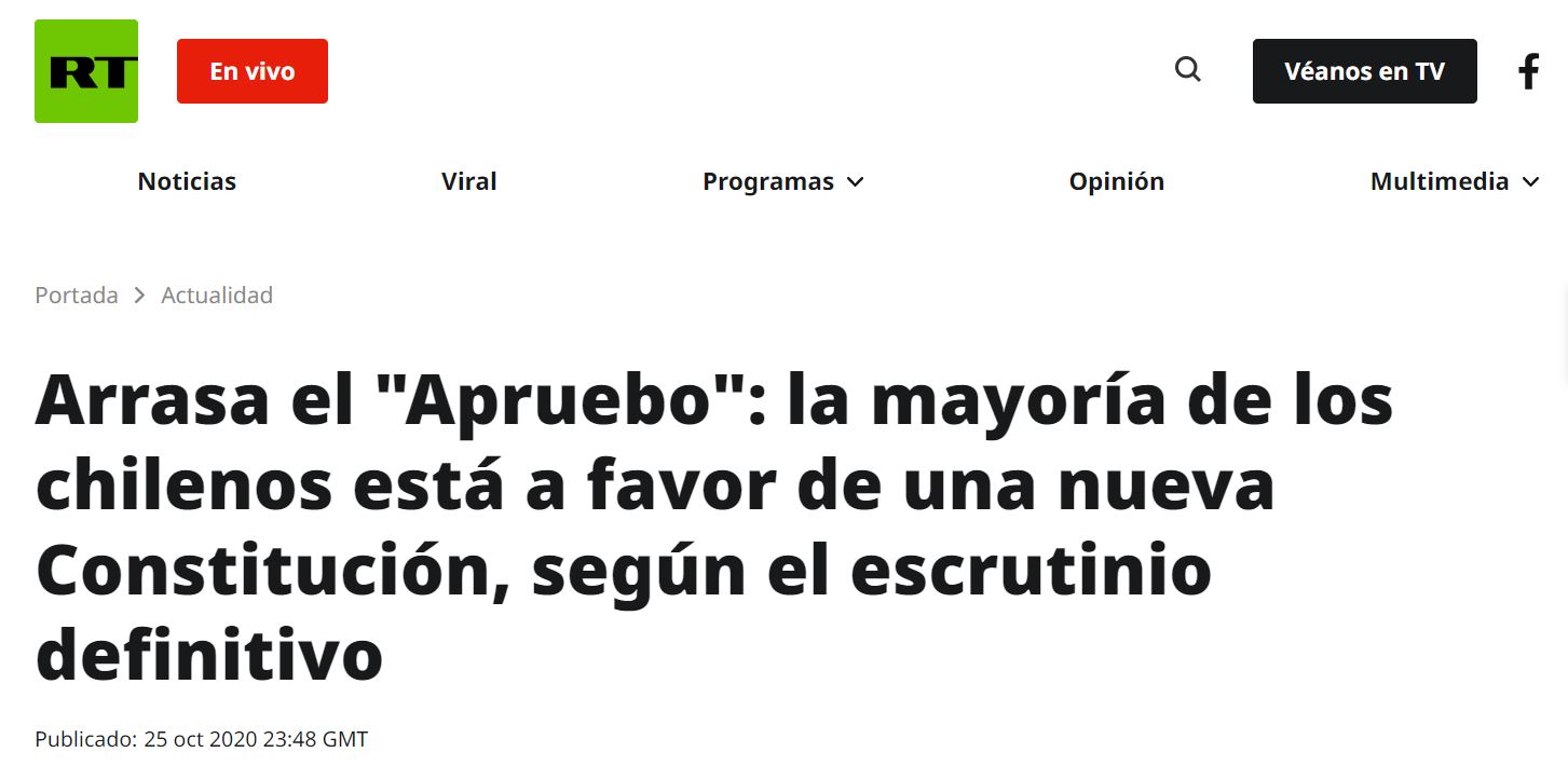 Finalmente, la cadena RT escribió: "Arrasa el "Apruebo": la mayoría de los chilenos está a favor de una nueva Constitución, según el escrutinio definitivo".