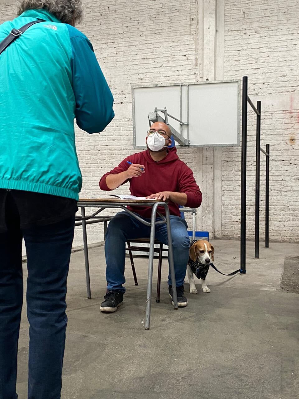 Daniel tuvo que acudir junto a su perro Tango para cumplir con este rol en la jornada del plebiscito. Es cuarta vez que fue citado a cumplir como vocal de mesa, pero es primera vez que dejan que su mascota lo acompañe.
