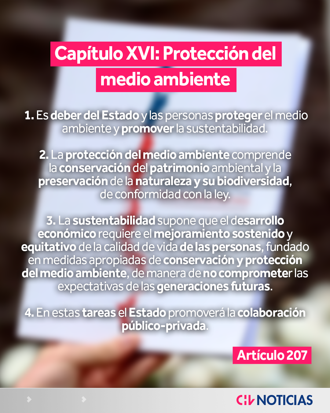 Sumado a lo anterior, es clave mencionar que en la Constitución actual no existe un capítulo centrado en el cuidado del medioambiente, a diferencia de la propuesta de Nueva Constitución que sí lo incluye.