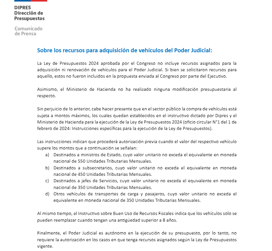 En un breve comunicado de dos párrafos, el organismo estatal aclaró que la compra aún no ha sido efectuada debido a que sigue en trámites, sin embargo, tampoco se retractan de ella. “En relación a las publicaciones aparecidas en la prensa con ocasión de la decisión de la Corte Suprema de renovar los vehículos institucionales, es oportuno aclarar que el acuerdo sobre el particular fue adoptado luego de un procedimiento de evaluación iniciado con anterioridad por la Corporación Administrativa del Poder Judicial", comenzó el escrito. Asimismo, respecto al uso de los recursos para efectuar la nueva adquisición, el organismo aseguró que: “Este proceso no ha culminado, por lo que aún no se han ejecutado los recursos fiscales que el Ministerio de Hacienda ha dispuesto para este preciso fin”. En relación a esta aprobación, la Dirección de Presupuestos lanzó un comunicado en el que afirman que el Poder Judicial es autónomo en la ejecución de su presupuesto.