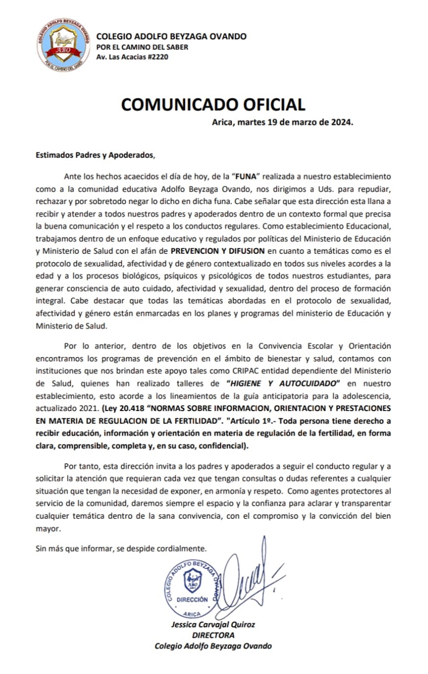 "Como establecimiento educacional, trabajamos dentro de un enfoque educativo y los planes y programas del Ministerio de Educación y Ministerio de Salud con el afán de prevención y difusión en cuanto a temáticas como es el