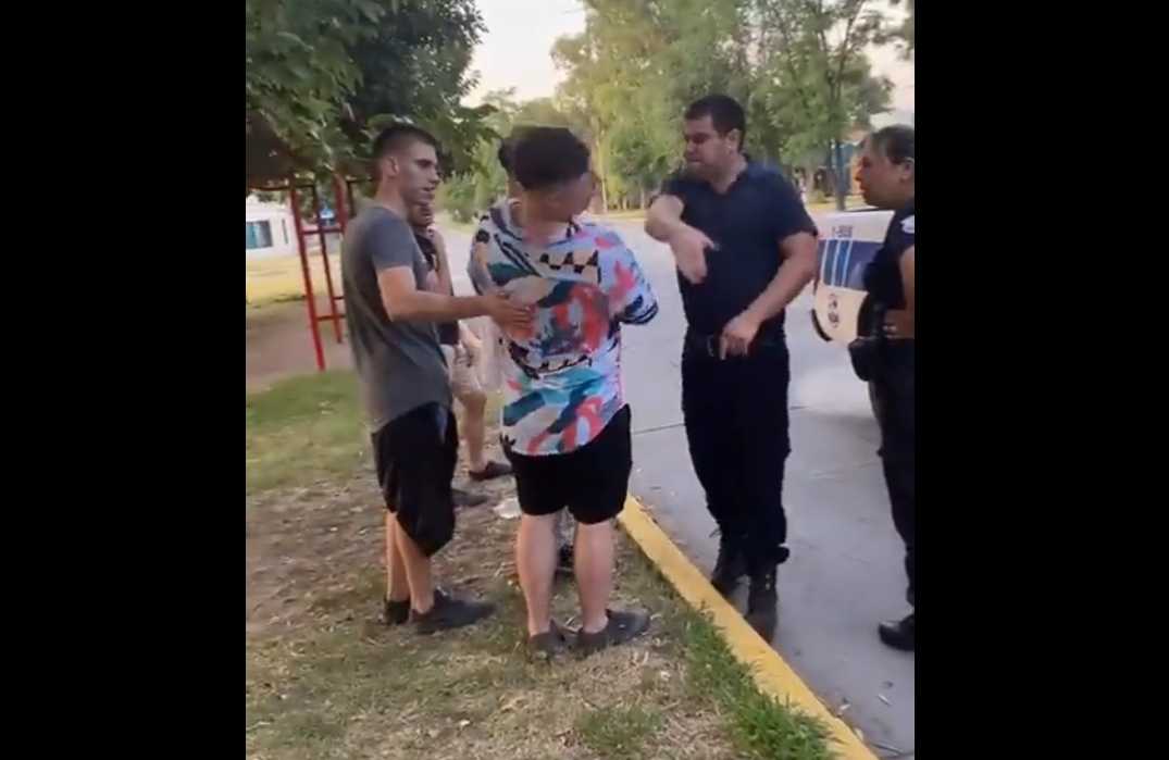 Según consignó Noticias Telefe, el hecho ocurrió en la ciudad de San Luis y el policía pertenece a Villa Mercedes. En el video de 6 segundos se puede ver a un grupo de jóvenes que es abordado por dos autoridades, mientras que uno de ellos parece increpar a uno de los chicos.