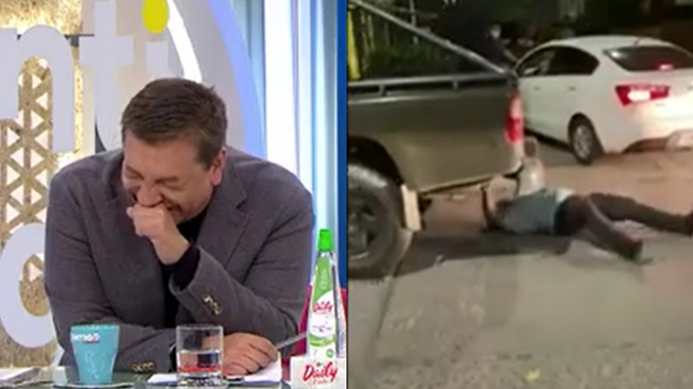 Así Julio César Rodríguez intentaba poner fin a casi dos minutos de un ataque de risa que vivió en Contigo en la Mañana de Chilevisión, al ver el insólito video sobre un hombre, que sería el pastor de un culto religioso, que fingió ser atropellado por un vehículo conducido por un militar.