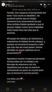 al parecer habían varios remix hablados hasta hace dos días que lo anuncié”. “Mi equipo de trabajo y yo valoramos y respetamos el trabajo de mis colegas, y aunque me encanta el proyecto y odio que este tipo de cosas pasen,