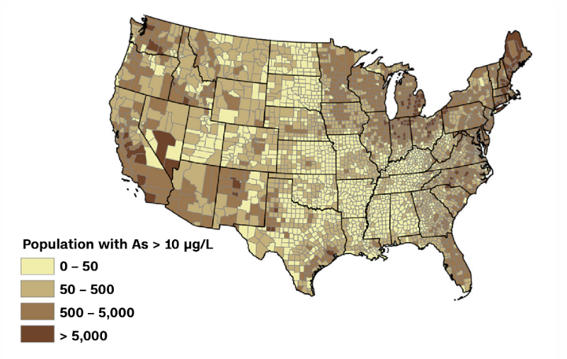 Los estados que pueden tener altos niveles de arsénico en el agua subterránea incluyen Washington, Oregon, Nevada, California, Arizona, Nuevo México, Maine, Massachusetts, Nuevo Hampshire, Nueva Jersey, Maryland, Michigan, Wisconsin, Illinois, Ohio, Indiana, Florida, Virginia, Carolina del Norte, Carolina del Sur.
