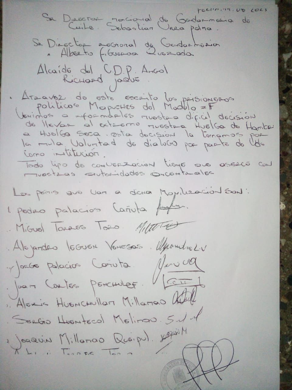 Se trata de 17 presos mapuche que llevan más de 100 días en huelga de hambre en la prisión de Angol y Temuco, pero nueve de ellos decidieron radicalizar su decisión a un huelga de hambre seca como presión para exigir pronunciamiento de las autoridades. Entre las demandas que solicitan se encuentra el restablecimiento del módulo de comuneros que tenían en la cárcel y el traslado de los seis que están en la cárcel de Temuco para poder mantener su cohesión como pueblo y su vínculo con la machi Isabel Puel, su autoridad espiritual. Así lo comunicó el lonko Víctor Queipul, quien se ha dedicado a visitar a los familiares de los presos movilizados y es el encargado de mantener conversaciones con la machi Isabel. Pese a que las autoridades se habían comprometido a resolver el tema en un corto plazo, el líder señaló que desde Gendarmería y el Gobierno “no han respondido al petitorio que tienen en la mesa con ellos”, según consignó Bio Bio. “Los derechos que reclaman los presos no son beneficios ni privilegios, sino que se basan en el convenio 169 de la OIT”, agregó Queipul argumentando que este apartado reconoce la diversidad cultural y los derechos colectivos de los pueblos indígenas. "Esta decisión la tomamos por la nula voluntad de diálogo por parte de uds. como institución", indicaron a través del comunicado que entregaron los reclusos anunciando la movilización. Asimismo, los familiares de y las organizaciones mapuche hicieron un llamado urgente al Gobierno para que atienda sus demandas, pues expresaron su preocupación por la salud de los presos, la que empeora cada día. Recordemos que los presos mapuche iniciaron su huelga en mayo, tras incidentes al interior de la cárcel de Angol, donde los reclusos se encontraban en un recinto especial que permitía la visita de sus familiares al menos tres días a la semana, sin embargo, Gendarmería disolvió el módulo.