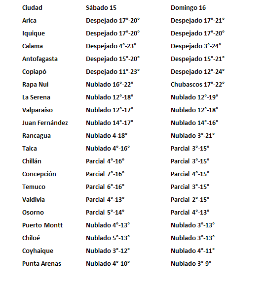 Se confirma la ausencia casi total de lluvias para este fin de semana de elecciones en Chile. De hecho, este sábado 15 de mayo sólo caerían precipitaciones en algunas islas de la Patagonia; mientras que el domingo 16 de mayo caerían chubascos en el sector insular de Magallanes y en Rapa Nui. En todo caso, en los lugares que recibirán agua no será nada intenso.