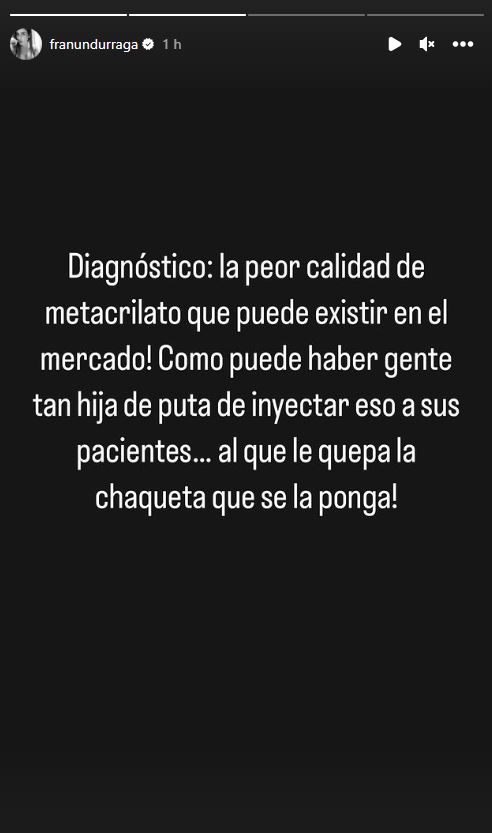 En una última historia, Francisca señaló que aún no ha podido investigar quién le puso esta sustancia en su nariz, "porque fue hace varios años". Pero a fin de cuidar a posibles futuras pacientes, afirmó que apenas sepa contará quién fue el o la responsable "para que nadie más caiga en manos tan inescrupulosas".