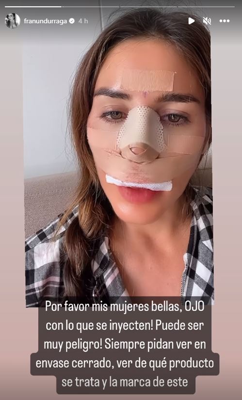 Una preocupante acusación realizó la modelo Francisca Undurraga a través de sus redes sociales, advirtiendo a sus seguidoras sobre las cirugías plásticas que en algunas ocasiones no terminan del todo bien. Según expuso la ex chica reality, quien apareció con su nariz vendada en un video, debió someterse a una operación para "mejorar varias cosas". "Tenía tabique desviado, hipertrofia de cornetes, pero lo peor de todo es que hace seis u ocho años me pusieron metacrilato en la nariz y yo no tenía idea", contó en el video. Respecto de esto último, hizo un llamado a que "todas las chicas revisen las sustancias que se están poniendo", ya que "el metacril es súper peligroso". Explicó que este elemento "además de migrar a otras partes del cuerpo, te puede generar necrosis, infecciones, deformidades, así que por favor, cuídense". Al cierre de su registro, reiteró a sus seguidoras que "siempre pidan ver envase cerrado, ver de qué producto se trata y la marca de éste".
