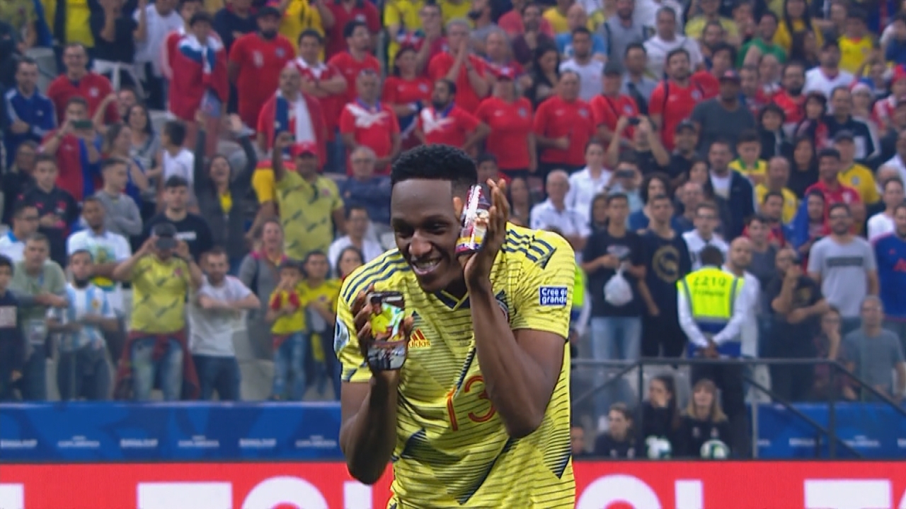 Minutos antes, Yerry Mina tomó la pelota y anotó el cuarto penal colombiano en la serie frente a Chile por los cuartos de final de la Copa América Brasil 2019.