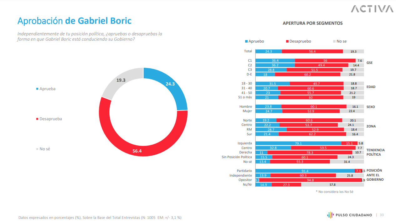 En concreto, el mandatario obtuvo una aprobación de un 24,3%, registrando una caída de 8,5 puntos en relación a la primera parte del mes de junio (32,8%). En tanto, la desaprobación tuvo un aumento de 6,1 puntos, posicionándose en 56,4%. Un 19,3% no sabe cómo evaluar su gestión.