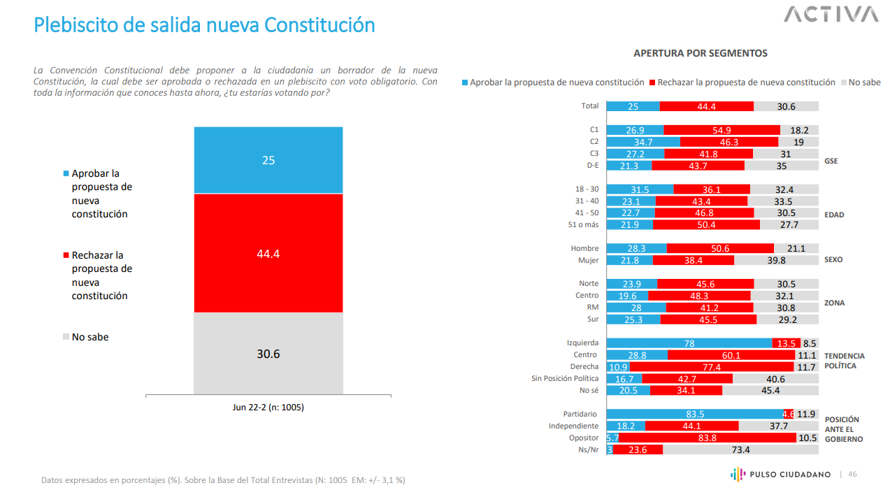 De acuerdo al resultado, un 44,4% estaría rechazando el borrador de la Nueva Constitución, aumentando 2,5 puntos en relación a la medición anterior. En la misma línea, un 25% la estaría aprobando el texto, registrando una disminución de 4,7 puntos y un 30,6% aún no define su voto.