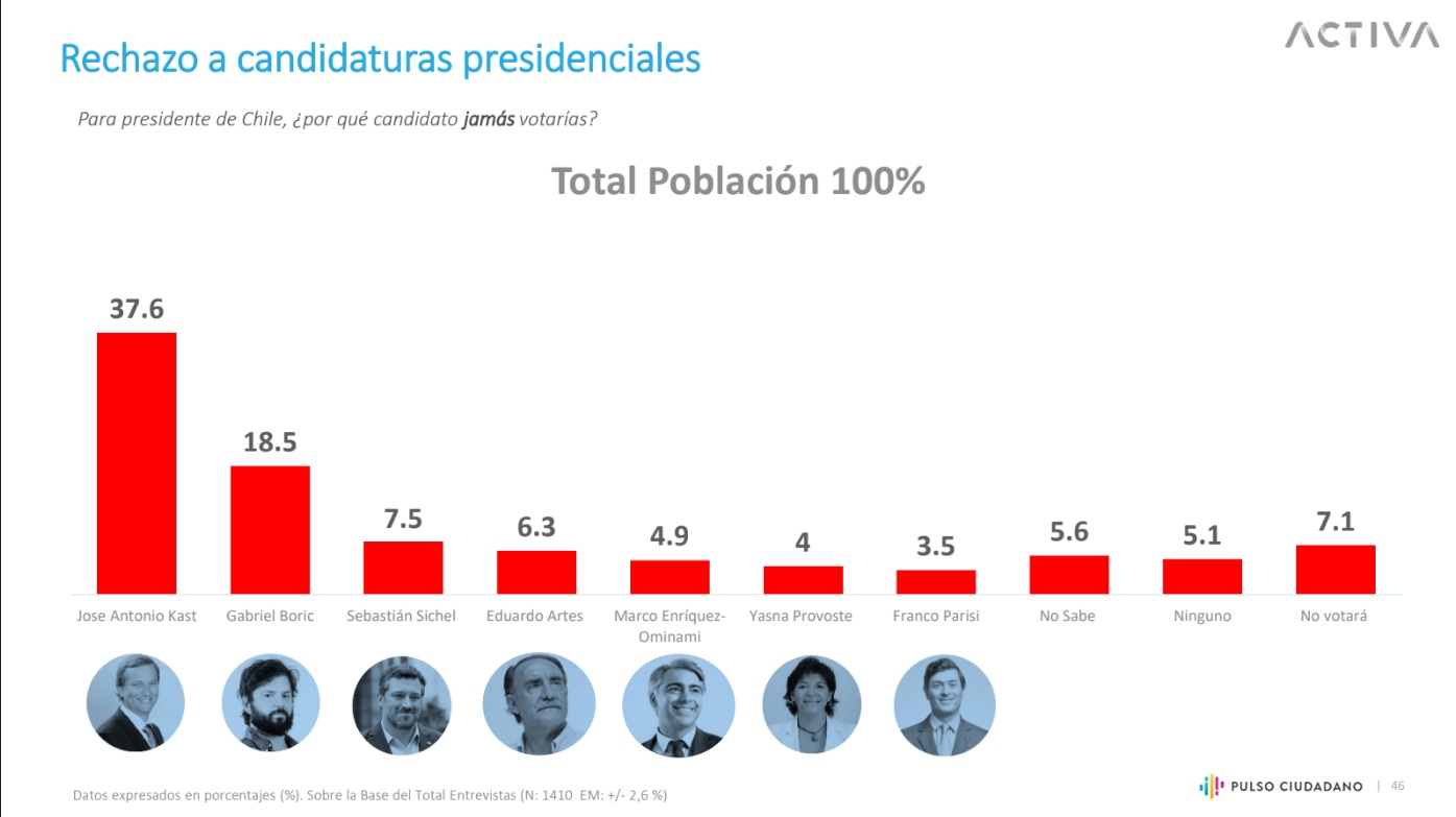 De esta manera, Kast y Boric lideran el ítem de los aspirantes a La Moneda que generan más rechazo en la población, obteniendo un 37,6% y un 18,5% respectivamente. El listado lo sigue Sebastián Sichel (7,5%), Eduardo Artes (6,3%), Marco Enriquez-Ominami (4,9%), Yasna Provoste (4,0%) y Franco Parisi (3,5%).