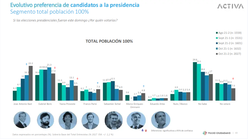 Lee también: Servel publicó la lista de vocales de mesa para las elecciones del 21 de noviembre: Revisa si fuiste designadoLa nueva encuesta Pulso Ciudadano arroja buenos resultados por el candidato presidencial por el Partido de la Gente, Franco Parisi. En este nuevo sondeo logra quedarse en el cuarto lugar, aumentando de un 5% a un 7,3%.