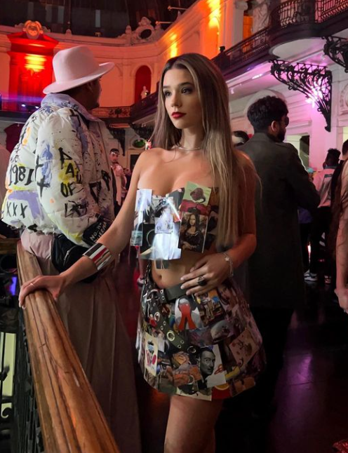 La cantante y ex participante del reality apareció con un traje hecho a mano, el cual consiste en imágenes de diversos artistas y pinturas distribuidas en un conjunto de dos piezas.