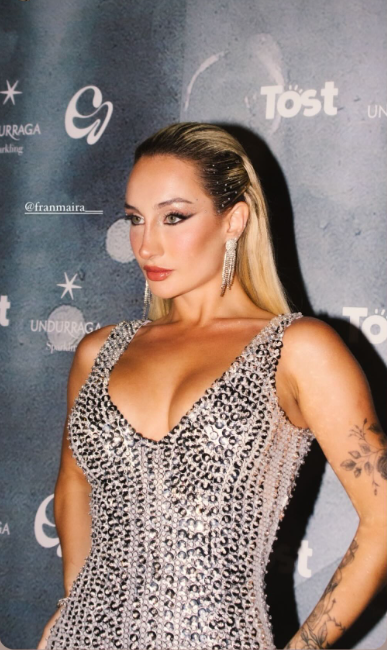 La ex participante de Gran Hermano Chile apareció con una capa negra que, posteriormente, destapó para dar paso a un vestido brillante con corte de sirena.