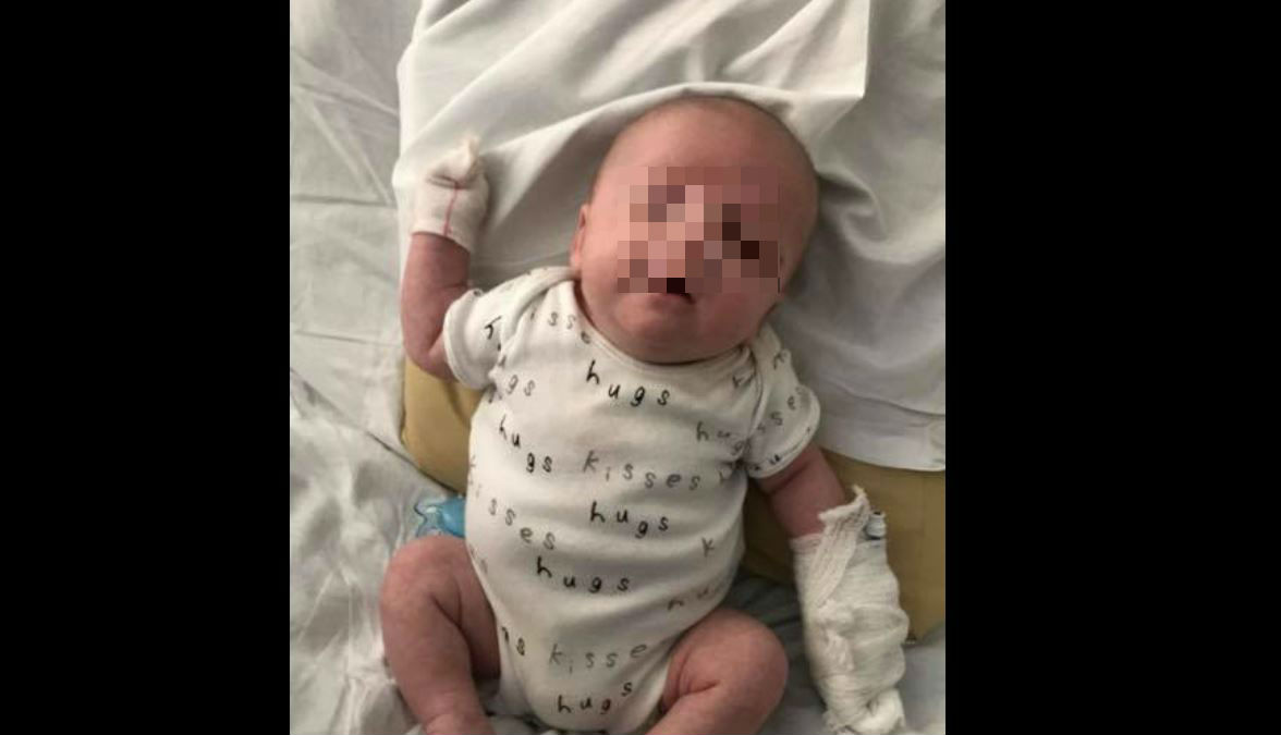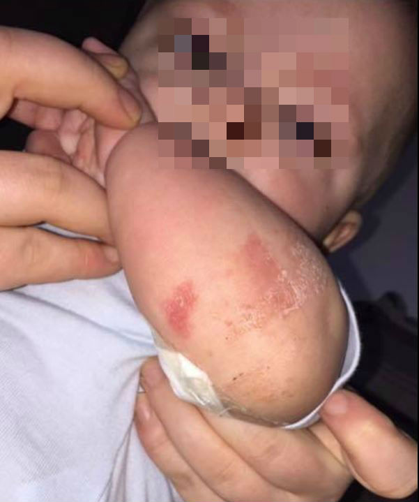 El bebé tenía una inflamación en su ojo y luego le aparecieron ampollas. La madre explicó que “muchos amigos lo abrazaron y besaron en el bautizo”.