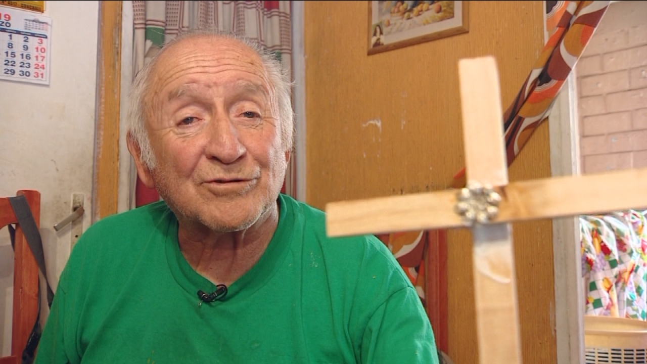 Para juntar la plata de todos los meses, Andrés Figueroa, quien recibe 208 mil pesos por jubilación y aporte del Estado, trabaja haciendo cruces de madera para venderlas fuera de una iglesia. Está asesorado por un abogado que acogió el caso y una perito judicial que sostiene le falsearon la firma.