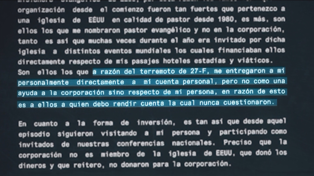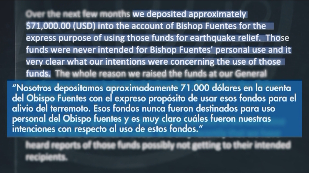 Pero su versión es desmentida por la corporación estadounidense, desde donde apuntan que "nosotros depositamos aproximadamente 71 mil dólares en la cuenta del obispo Fuentes con el expreso propósito de usar esos fondos para el alivio del terremoto. Esos fondos nunca fueron destinados para uso personal del Obispo fuentes y es muy claro cuáles fueron nuestras intenciones con respecto al uso de estos fondos".