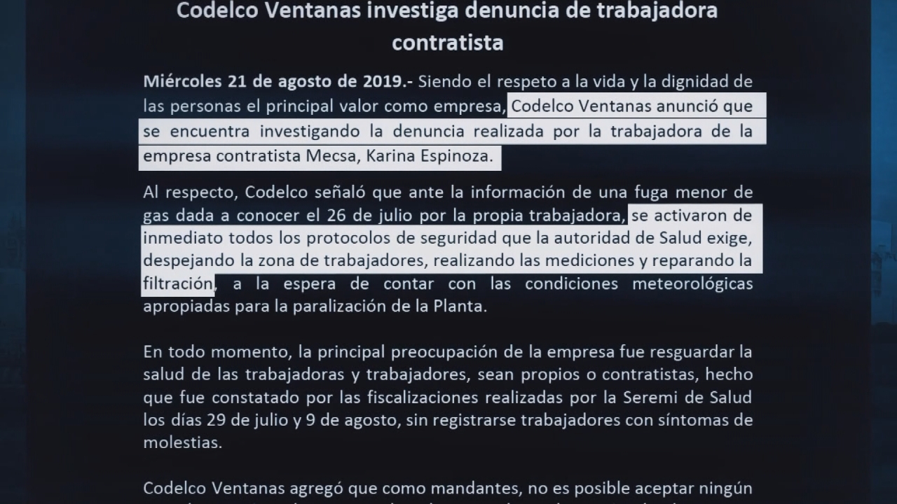 Respecto a lo anterior, Codelco Ventanas, sólo por medio de un comunicado, aseguró que inició una investigación respecto a la denuncia de la prevencionista. Y que en el momento de la fuga, se activó el protocolo de seguridad para resguardar a los trabajadores.