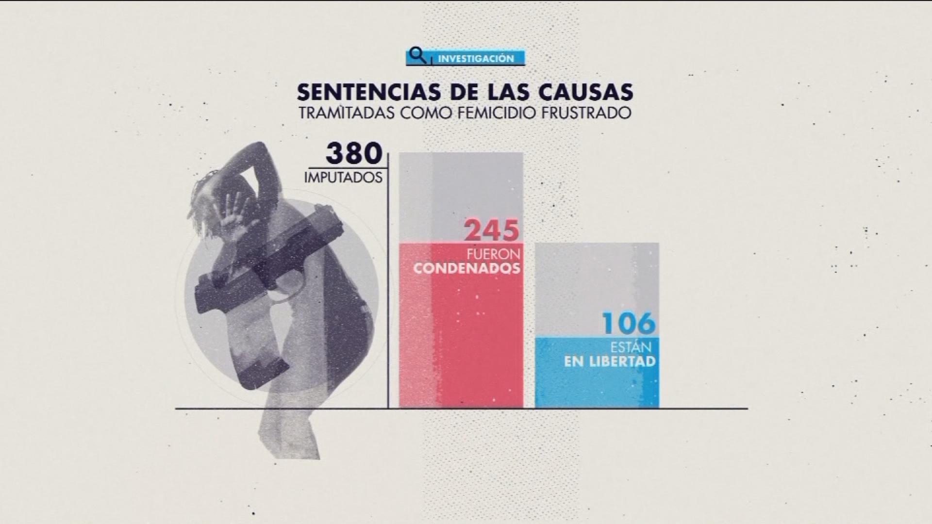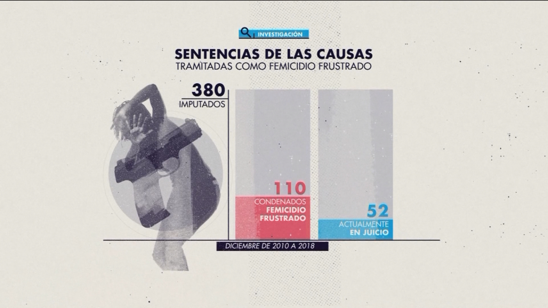 Del total de 380 imputados por femicidio frustrado entre diciembre de 2010 y diciembre de 2018, sólo 110 fueron condenados por este delito, 135 recibieron condenas por delitos menores como agresión o amenaza y 52 siguen actualmente en juicio. En otras palabras, el 54% de los acusados se libró de una condena por femicidio frustrado.