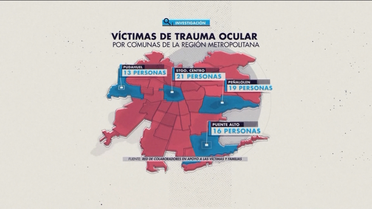 Desde la Red de Colaboradores en apoyo a víctimas de trauma ocular y sus familias, aseguran que Santiago Centro y Peñalolén son las comunas con más heridos que hoy se atienden en la Unidad de Trauma Ocular (UTO) del Hospital del Salvador. La organización creó un mapa donde además identifican que a nivel país, la Región Metropolitana es la que tiene más afectados.