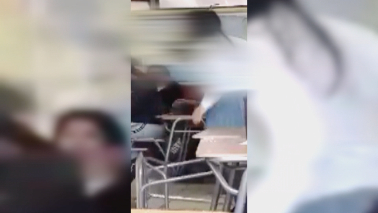 Pero está lejos de ser el único. Otro video muestra una pelea en un liceo en Los Ángeles donde un alumno amenaza a una compañera que está sentada en su puesto.