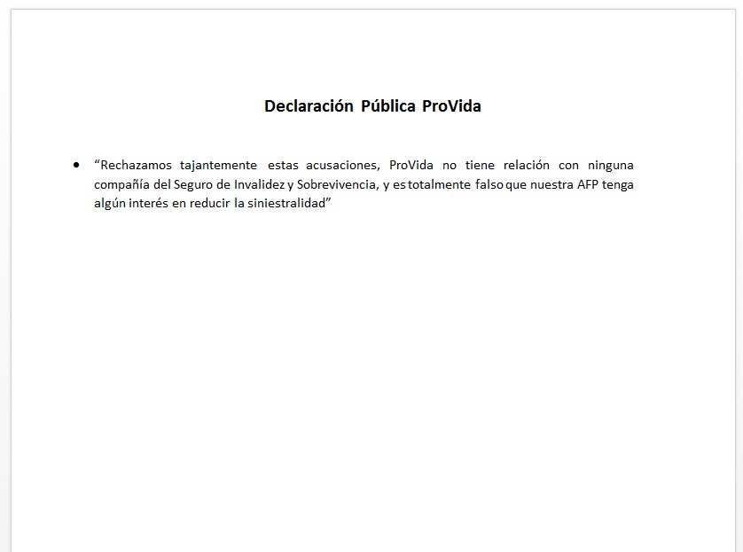 Mediante un escueto comunicado, AFP Provida, ex empleador de Alejandra, aseguró que rechazan tajantemente estas acusaciones, añadiendo que ProVida no tiene relación con ninguna compañía del Seguro de Invalidez y Sobrevivencia, y que es totalmente falso que la AFP tenga algún interés en reducir la siniestralidad.