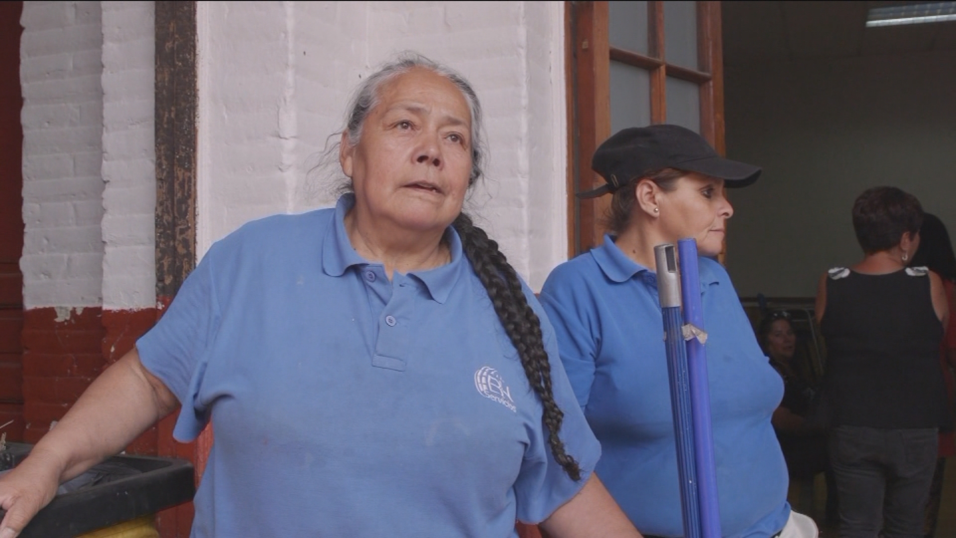 Lee también: Galletas y dulces “Las Condenadas”: El sabor de la reinserción socialJeannette Valenzuela tiene 63 años y está encargada de limpiar los baños y las salas. Es una más de las casi 300 mujeres que hacen este trabajo al interior de las amplias dependencias de la Usach. Todas usan el mismo uniforme y, a la distancia, no es fácil identificar quién es quién.