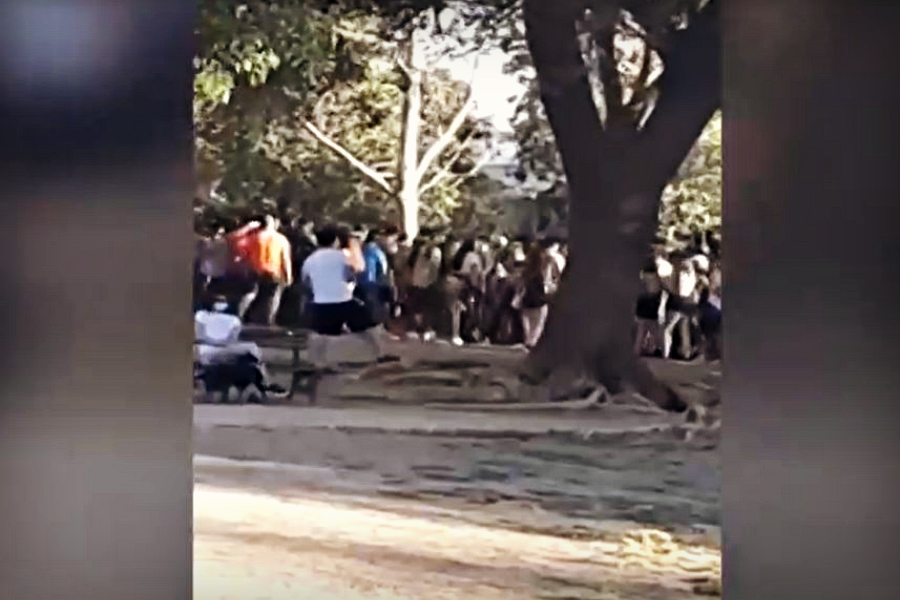 En plena pandemia, cientos de jóvenes comparten en una multitudinaria fiesta en la Plaza Brasil, en el centro de Santiago. La imagen pudo ser vista durante este fin de semana, algo que dejó impresionados a los vecinos del sector.