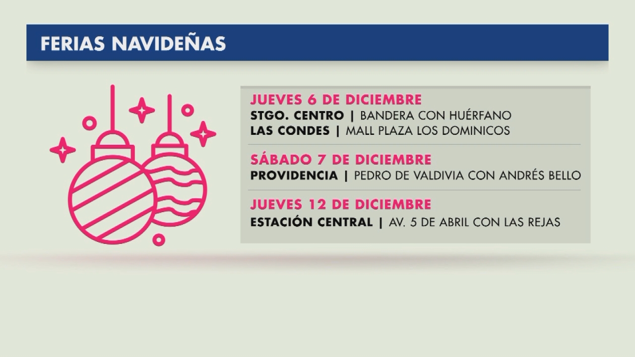 Las ferias más próximas en abrir son en Bandera con Huérfanos, Mall Plaza Los Domínicos, en Pedro de Valdivia con Andrés Bello, Avenida 5 de Abril con Las Rejas, Casa Piedra, José Miguel de la Barra y otra en Avenida Vicuña Mackenna.
