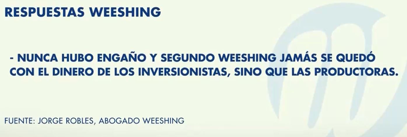 Desde Weeshing dicen que no se quedaron con el dinero de los inversionistas, "sino que las productoras". En tanto que desde una de las mismas empresas vinculadas por el sitio, señalan no tener relación con ella. Mientras, las personas llevan dos años sin obtener respuestas.