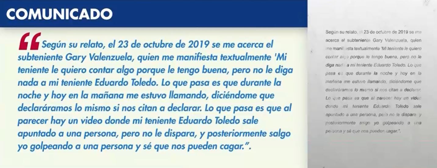 Lee también: Ex carabinero sospechoso de femicidio habría participado en golpiza fatal contra Álex Núñez durante el estallido"Según su relato, el 23 de octubre de 2019, se me acerca el subteniente Gary Valenzuela, quien me manifiesta textualmente 'mi teniente, le quiero contar algo porque le tengo buena, pero no le diga nada a mi teniente Eduardo Toledo. Lo que pasa es que me estuvo llamando, diciéndome que declaráramos lo mismo si es que nos citaban. Al parecer, hay un video donde mi teniente sale apuntado a una persona, pero no le dispara y posteriormente salgo yo golpeando a una persona y sé que nos pueden cagar'".