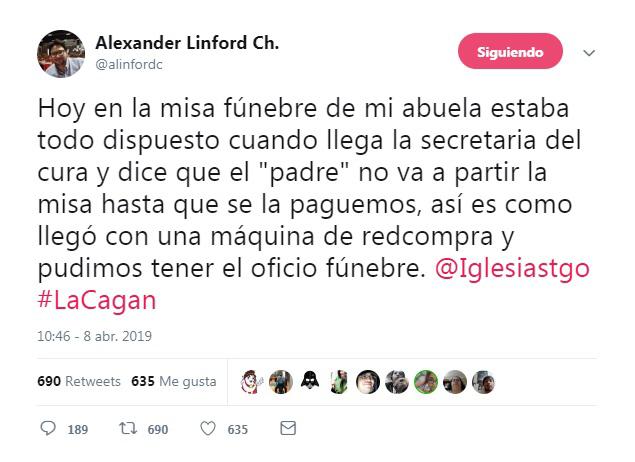 Una insólita situación se registró durante un velorio en la parroquia San Patricio, en la comuna de Las Condes. Alexander Linford utilizó su cuenta de Twitter para denunciar que personal de la iglesia les cobró $40.000 por realizar la misa fúnebre. Y advirtieron que, de no pagar, ésta no se realizaría.