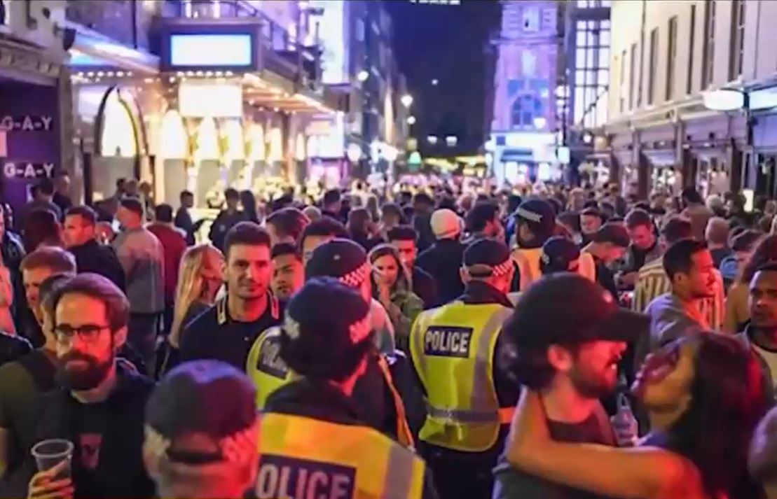 Ciento de jóvenes se reunieron en el popular barrio bohemio de Soho, una zona de la capital inglesa de Londres