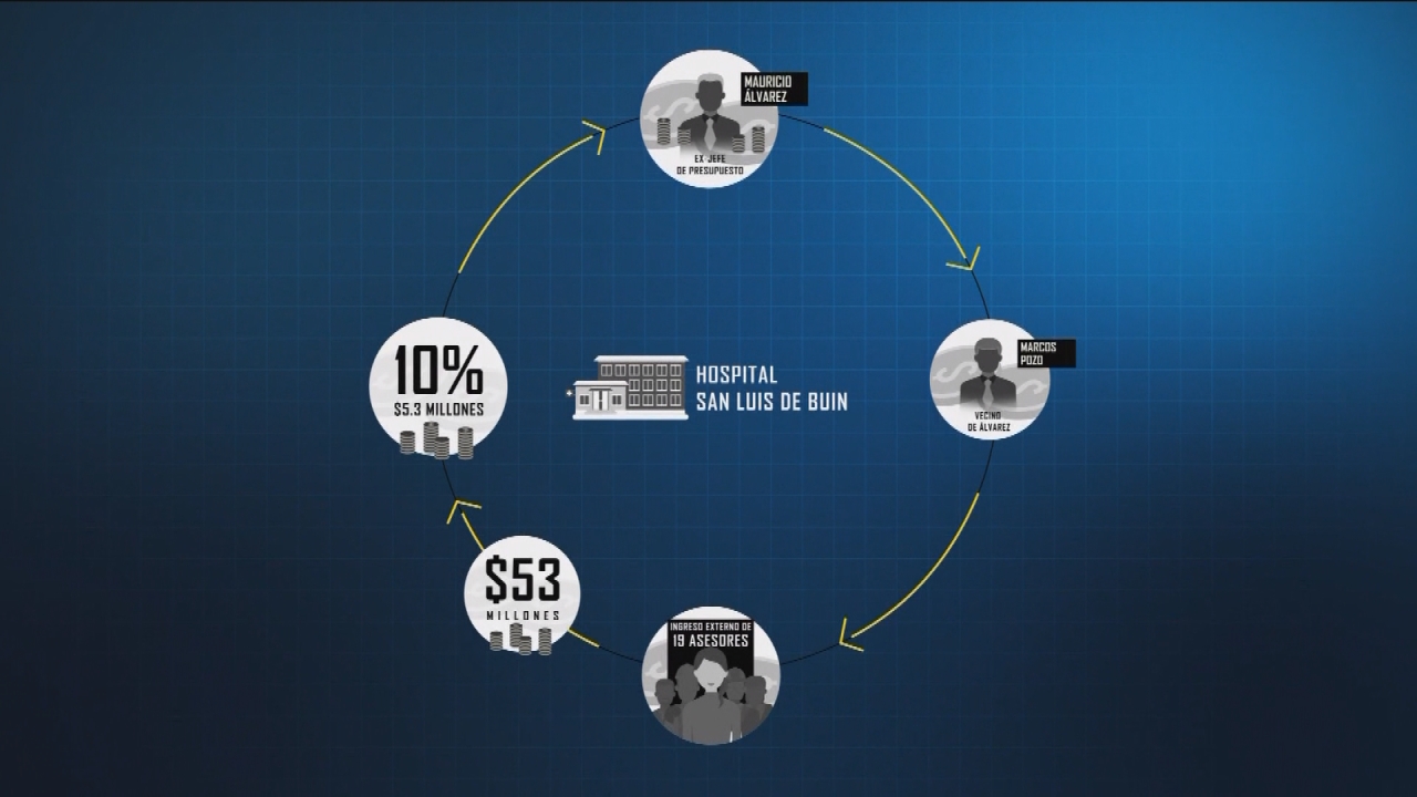 El esquema de coimas y fraude al fisco sería así: Mauricio Álvarez le habría dicho a su vecino Marcos Pozo que arme una comisión de 19 personas para revisar el proyecto del hospital de Buin. Entre todos ganarían $53 millones. Pero cada uno debería aportar un 10% de su remuneración para pagarle a Pozo el favor de haberlos contratado. Una coima de $5,3 millones mensuales.