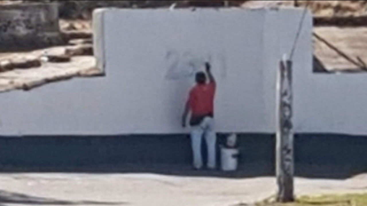 Además entregaron una foto que correspondería a la mañana de este miércoles y que revela el momento en que trabajadores de la empresa borraban del muro exterior la pintura que daba cuenta la dirección del lugar. La misma que aparecía en mercado público.