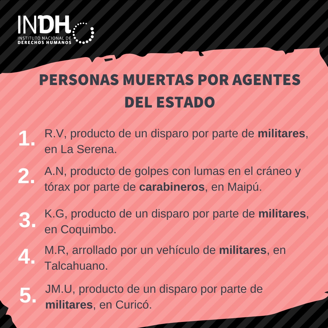 Lee también: "Hasta que la dignidad se haga costumbre": Cómo surgió la frase emblema del estallido social chilenoDesde el INDH entregan la información de la quinta persona muerta, esta vez por Carabineros. Se trata de Alex Núñez Sandoval, de 39 años, quien falleció durante la noche del lunes en el Hospital Asistencia Pública.