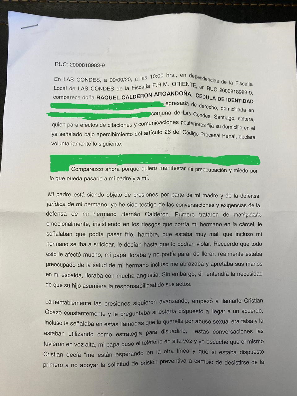 "Ahí lo amenazan o extorsionan diciéndole que tenían una segunda querella lista que involucraba a otra ex de mi hermano por abuso sexual de iniciales J.A. y que no había forma de que a ella 'la dieran vuelta' porque ya había aceptado un departamento en Las Condes", afirmó Raquel.
