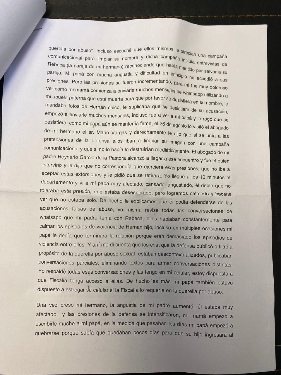 "Incluso en múltiples ocasiones mi papá le decía que terminara la relación porque eran demasiado los episodios de violencia entre ellos. Y ahí me di cuenta que los chat que la defensa publicó o filtró apropósito de la querella por abuso sexual estaban descontextualizados, publicaban conversaciones parciales, eliminando textos para armar conversaciones distintas", declaró.