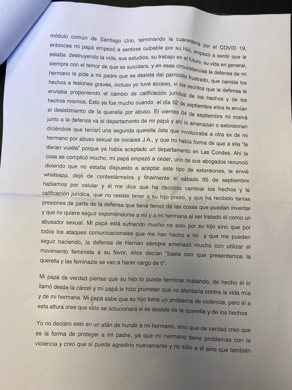Y continúa: "Mi papá está sufriendo mucho no sólo por su hijo, sino que por todos los ataques comunicacionales que me han hecho a mí y que me pueden seguir haciendo, la defensa de Hernán siempre amenazó mucho con utilizar el movimiento feminista a su favor, ellos decían 'basta con que presentemos la querella y las feminazis se van a hacer cargo de ti'".