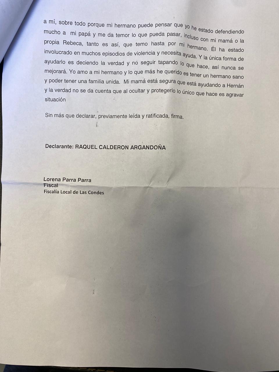 Ahora, es la declaración de la hermana del imputado, Raquel Calderón Argandoña, la que suma nuevos antecedentes a la profunda trama detrás del caso.