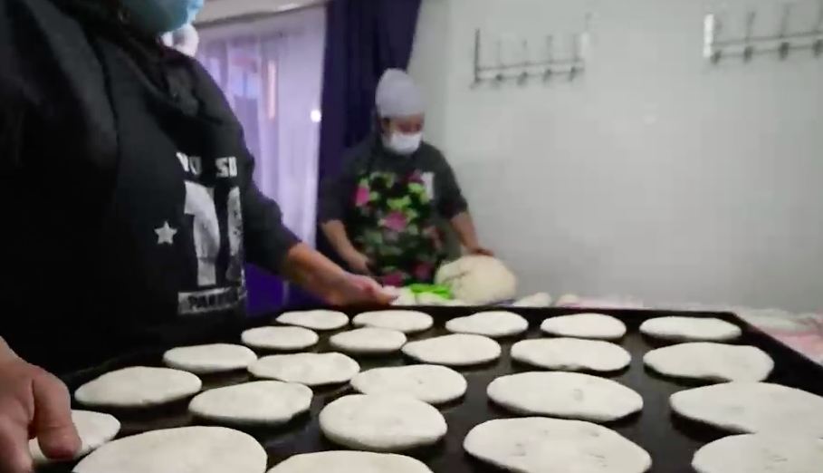 Un grupo de mujeres, en tanto, reciben harina y levadura de una persona que les entrega ayuda. Juntas, hacen unos 300 panes para repartir entre sus propios vecinos.