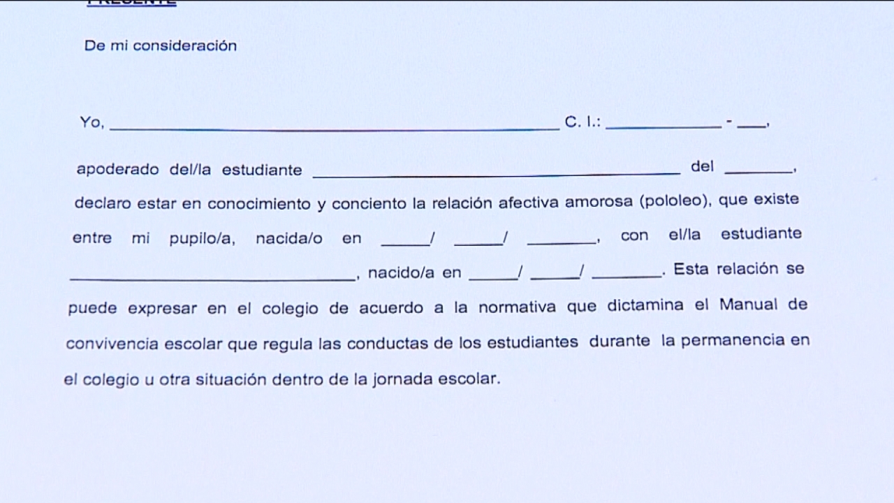 Un documento que además tiene una regla clara: no puede haber más de una año de diferencia entre ambos pololos. Normativa que en el colegio, aseguran, pasa por un tema legal.